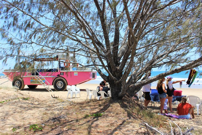 To lunch with nature on the secluded beaches of Eurimbula National Park is what our LARC + Lunch! tour is all about. Cruise the shoreline of our local National Parks and arrive on the beach where lunch will be served to guests in THE most “beach front” setting you can get! Feel the sand between your toes as you enjoy your catered lunch while watching the beautiful waters of Bustard Bay. This 2 hour tour is a perfect Sunday Lunch activity for the whole family. It is also a great tour that can be chartered for a special event like a birthday party or corporate team bonding session. Bring the cricket bat for beach cricket or throw your swimmers in for a quick dip. The LARC + Lunch! tour is for everyone to enjoy!