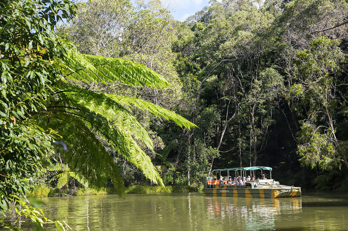 Your experience includes a journey on the historic Kuranda Scenic Railway, before visiting the award-winning Rainforestation Nature Park, where you can take a tour on a historic World War II Army Duck over land and through water. Join a guided tour and see crocodiles, koalas, snakes, dingoes, a cassowary and the only Tasmanian Devils in North Queensland. Handfeed kangaroos and wallabies, and even cuddle a koala (additional cost).